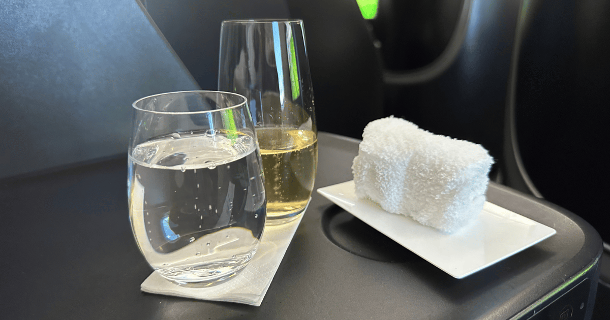 The crew was very friendly from the start, and immediately offered a selection of beverages plus a cold towel. I enjoyed a glass of champagne (Taittinger) and a sparkling water.