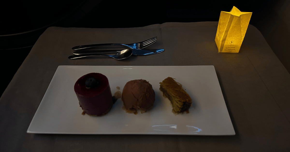 Next and finally was dessert, which was again served from a well outfitted trolley-cart. Unfortunately I was unable to take a picture of the cart itself, but I had a sampling that included Baklava, strawberry ice cream, and a chocolate-fruit tart.