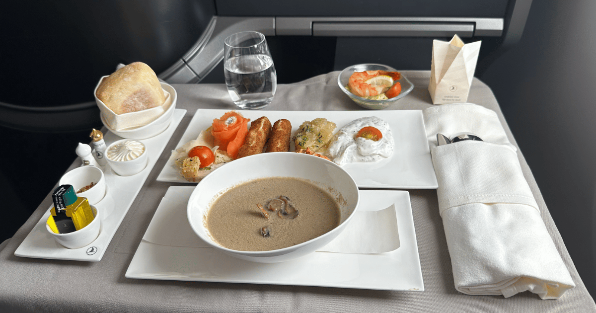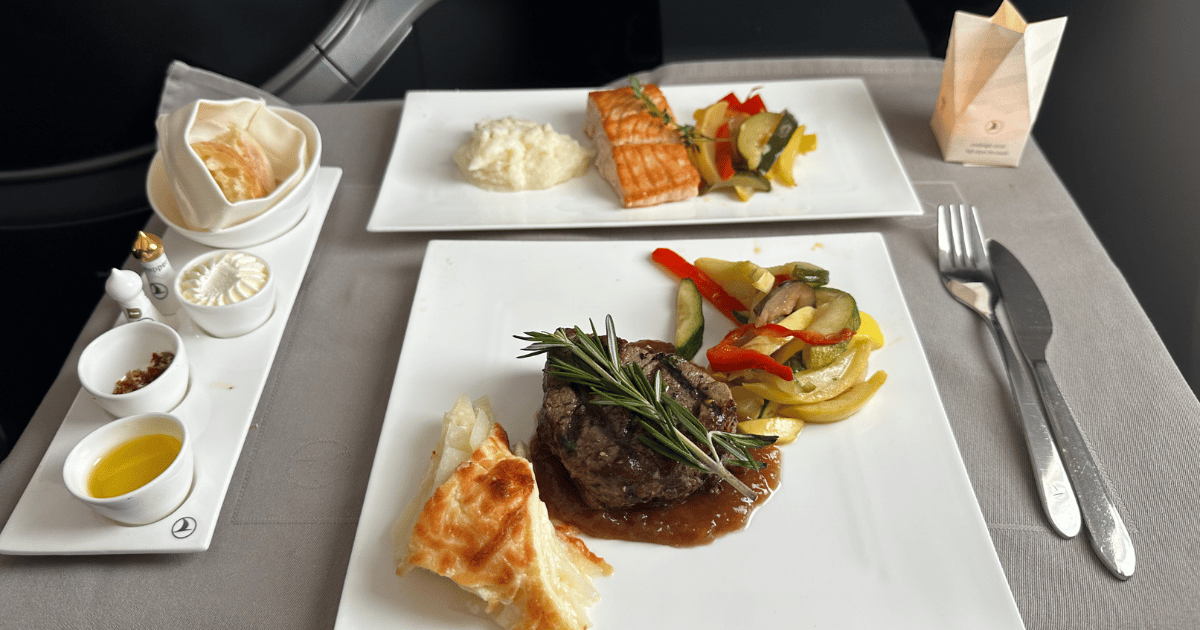 Our crew sprang into action near immediately after takeoff and the dinner service began. It all felt a little like the song “Be Our Guest” from Beauty and the Beast (in the best way). The service and presentation, insofar as airline meals go, was next level.