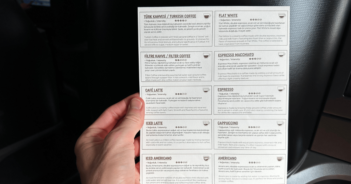 The crew did pass out a fairly extensive coffee menu, too — though somewhat unimaginatively I went with a basic cup of black coffee. It was still really great.